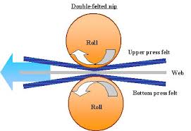 A Double Felted Jumbo Press is a press configuration where the wet board web is supported by two press felts—one on the top side and one on the bottom side—while passing through a press nip formed by a large-diameter jumbo roll and a counter roll.