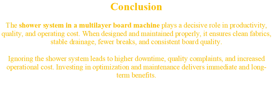 In a multilayer board machine, consistent runnability and board quality depend heavily on fabric cleanliness and machine hygiene. One of the most overlooked yet critical systems responsible for this is the shower system.